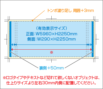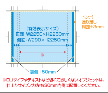 • 有効表示サイズW2830×H2250mm(正面+側面)に対し、裏側に周る分として左右各50mm伸ばした上で、周囲の塗り足し3mmで制作してください。