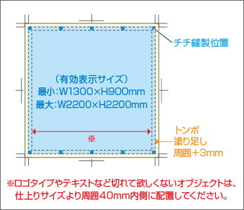 印刷時に印刷方向に若干(30mm程度)の伸びが生じるのと、上下各5ヶ所にチチ縫製もございますので、ロゴタイプやテキストなど切れて欲しくないオブジェクトは、仕上りサイズより周囲40mm以上内側に配置してください。