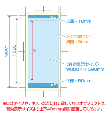 • 有効表示サイズ W600×H1575mmに対し、上に10mm、下に50mm、データを伸ばしてください。(本体へセットするために必要な部分です)その上で、周囲の塗り足し3mmで制作してください。印刷時に印刷方向に若干(20mm程度)の伸びが生じます。ロゴタイプやテキストなど切れて欲しくないオブジェクトは、余裕をもって仕上りサイズより上下40mm以上内側に配置してください。