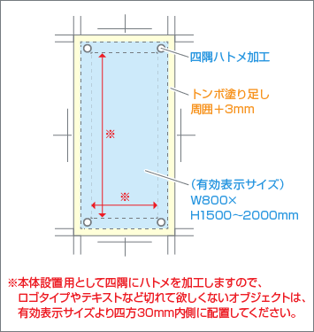 • 有効表示サイズ W800×H1500〜2000mmと高さを設定することが可能です。周囲の塗り足し3mmで制作してください。印刷時に印刷方向に若干(20mm程度)の伸びが生じます。本体設置用として四隅にハトメを加工しますので、ロゴタイプやテキストなど切れて欲しくないオブジェクトは、仕上りサイズより四方30mm以上内側に配置してください。
