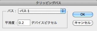 再度パスウィンドウのメニューを表示して「クリッピングパス...」を選択します。 保存したパス名を選択して平滑度を「0.2」デバイスピクセルと入力してください。