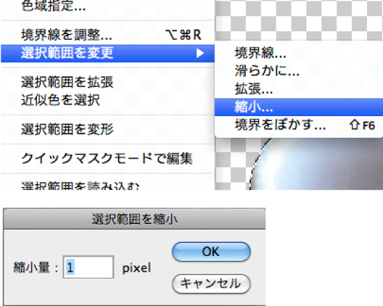 輪郭に沿った選択範囲でパスを作成すると若干ですが背景の白が出てしまうので、選択範囲を縮小します。 選択範囲 > 選択範囲を変更 > 縮小... を選択して、選択範囲を1ピクセル縮小します。